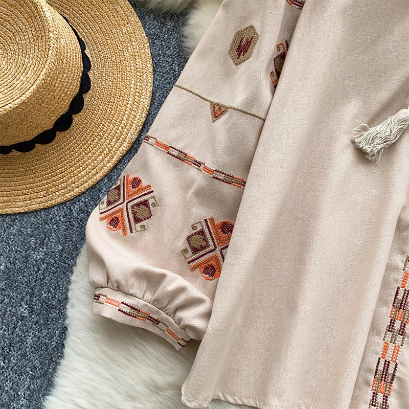La camicia da donna con maniche a lanterna e ricamo in stile etnico cattura la bellezza folk senza tempo con i suoi intricati ricami e la silhouette rilassata. Realizzata in un traspirante misto cotone e lino, questa maglia in taglia unica presenta una scollatura rotonda a V con coulisse regolabili e morbide maniche a lanterna che aggiungono movimento e fascino. 🌾✨