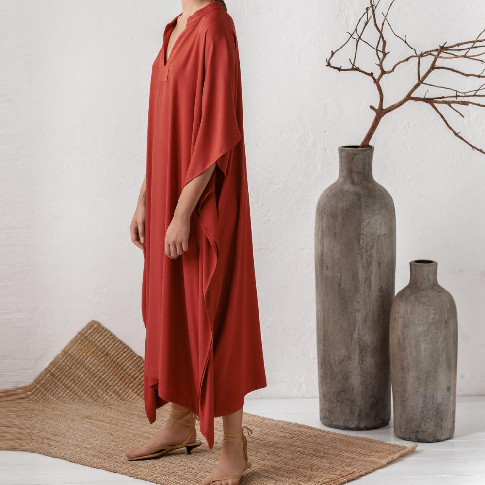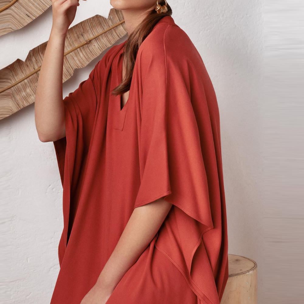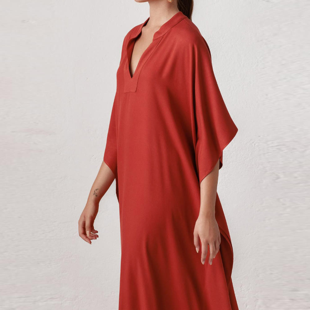 Disponibile in un rosso acceso e nel classico nero, ogni tonalità esprime il suo mood: sicurezza ardente o raffinatezza senza tempo. Indossalo sopra un costume da bagno o per una cena in riva al mare. Questo caftano è il tuo capo essenziale per le vacanze. ☀️🌴✨