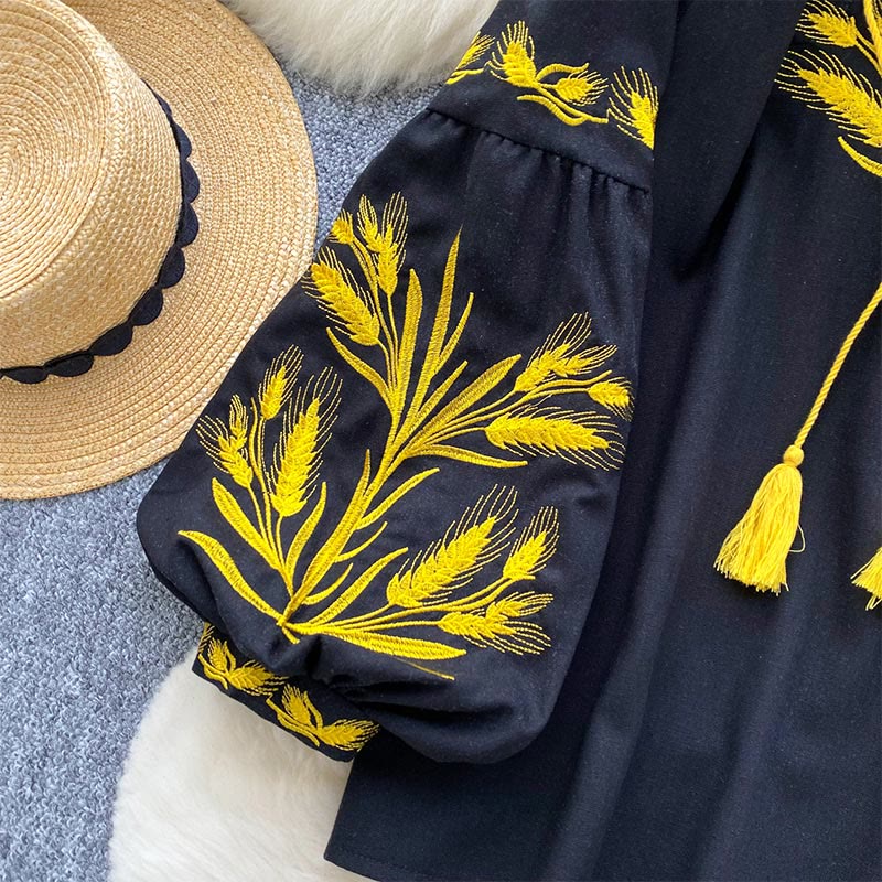 Ispirata ai raccolti dorati e alla serenità rustica, la camicia da donna con ricamo spighe di grano dorate cattura l'essenza della forza silenziosa della natura. 🌾✨ Realizzata in un traspirante misto cotone e lino, questa blusa taglia unica presenta un intricato ricamo a spighe di grano sul davanti, completato da una morbida scollatura a V con coulisse e maniche a lanterna fluide per una silhouette delicata ed elegante.
