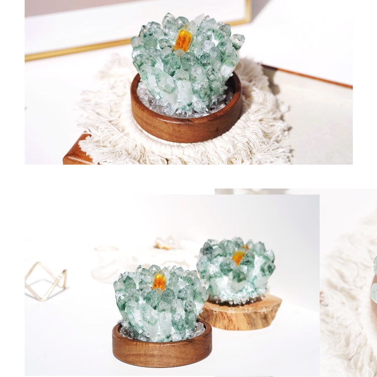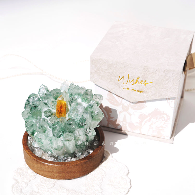 Caratterizzata da Quarzo Phantom Verde su una base in legno massello, questa decorazione riecheggia la forma di una succulenta, con Citrino al centro per un tocco di prosperità. Simboleggia la crescita personale e l'abbondanza, rendendola più di un semplice pezzo decorativo. Perfetta per coloro che cercano di armonizzare il proprio spazio con le energie calmanti e arricchenti della natura e dei cristalli.