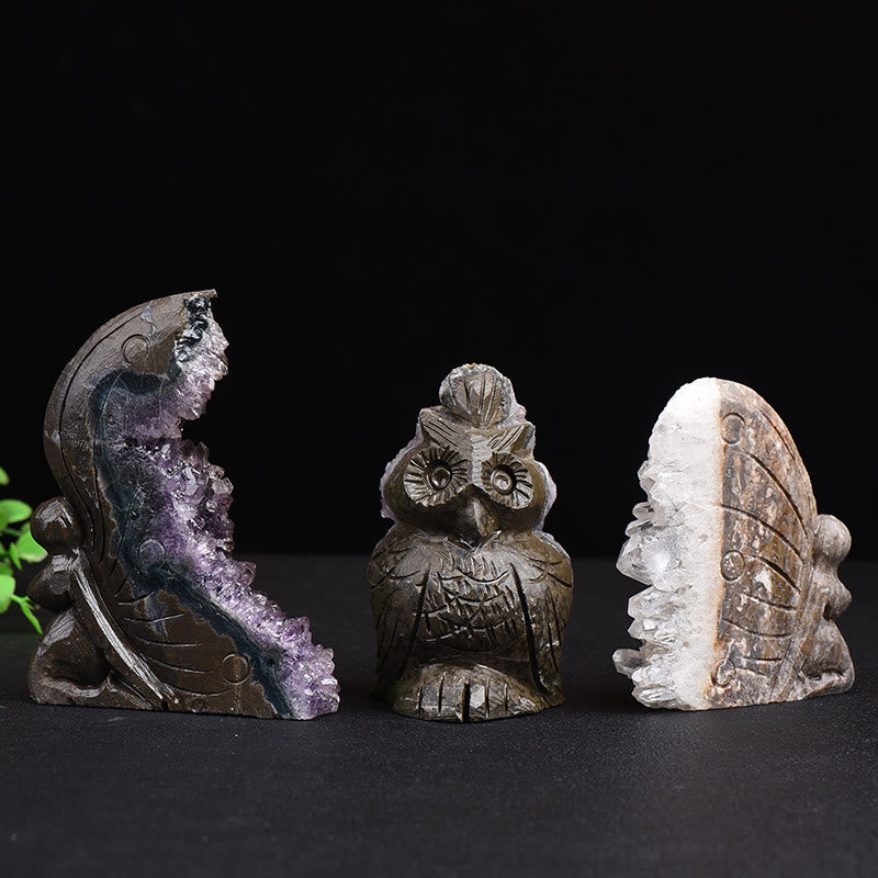 Ornamento intagliato a forma di gufo con farfalla in ametista naturale Olivenorma