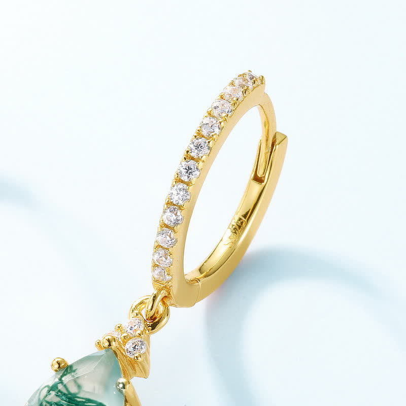 Il set di gioielli in agata muschiata presenta squisite pietre di agata muschiata a forma di goccia d'acqua, incastonate in un lussuoso argento sterling placcato oro. L'agata muschiata, celebrata per le sue proprietà radicanti e ringiovanenti, è elegantemente incorniciata dal ricco oro, aggiungendo un tocco di opulenza. Questo set include orecchini, una collana e un anello ciascuno, progettati per promuovere l'equilibrio e il rinnovamento, offrendo al contempo un fascino raffinato e senza tempo.