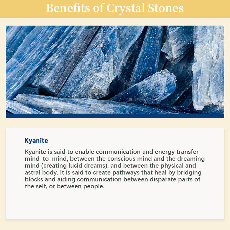 Si dice che la cianite consente la comunicazione e il trasferimento di energia da mente a mente, tra la mente cosciente e la mente sognante (creando sogni lucidi) e tra il corpo fisico e quello astrale. Si dice che crei percorsi che guariscono colmando i blocchi e favorendo la comunicazione tra parti disparate del sé o tra persone.