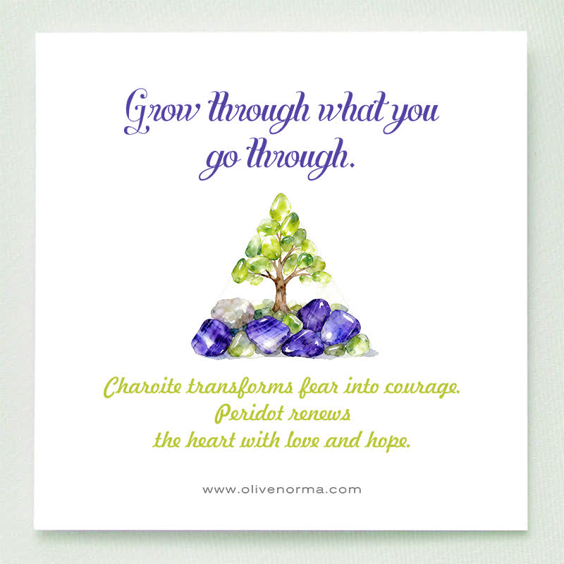 La Charoite trasforma la paura in coraggio, mentre il Peridoto rinnova il cuore con amore e speranza.