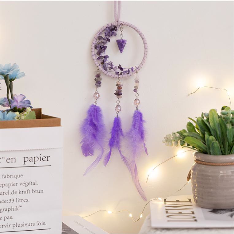 Scopri la bellezza tranquilla Ciondolo Ametista Olivenorma Piccola Piuma Mezzaluna Acchiappasogni. Decorato con un autentico ciondolo di ametista, porta relax, guarigione ed energia positiva al tuo spazio.