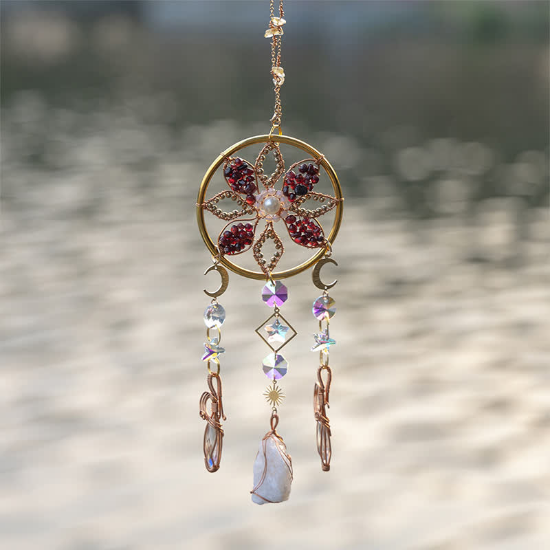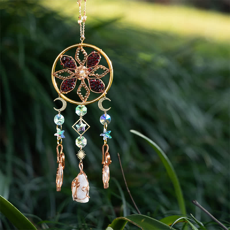 I campanelli eolici Natural Crystal Flower presentano uno splendido centrotavola di fiori di granato, che simboleggiano amore e passione. Realizzati con pietre preziose autentiche come cristallo trasparente e quarzo rosa, questi campanelli eolici promuovono l'equilibrio emotivo e l'energia positiva. Il filo di rame resistente aggiunge eleganza, rendendoli un'aggiunta perfetta alla tua casa o al tuo giardino, invitando un'atmosfera serena e sollevando il tuo spirito.