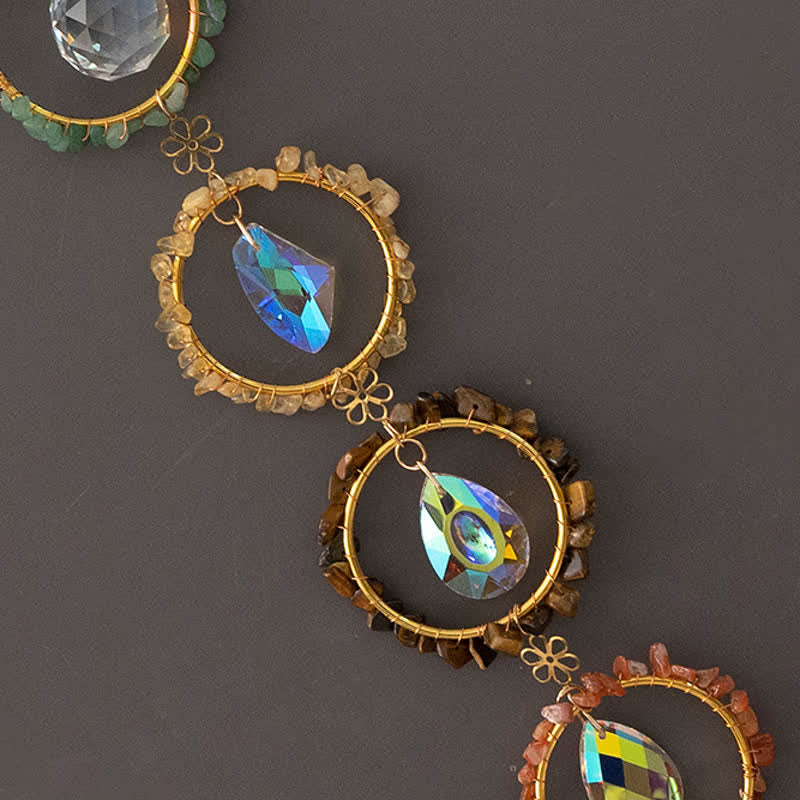 Il carillon a vento Chakra Gravel Dreamcatcher unisce la bellezza vibrante all'equilibrio spirituale. Caratterizzato da pietre chakra colorate, questo carillon a vento migliora il benessere emotivo e spirituale. Il design dell'acchiappasogni simboleggia protezione e armonia, mentre i suoni rilassanti del carillon creano un ambiente sereno. Questo pezzo artigianale aggiunge un tocco di bellezza mistica e favorisce un'atmosfera armoniosa.