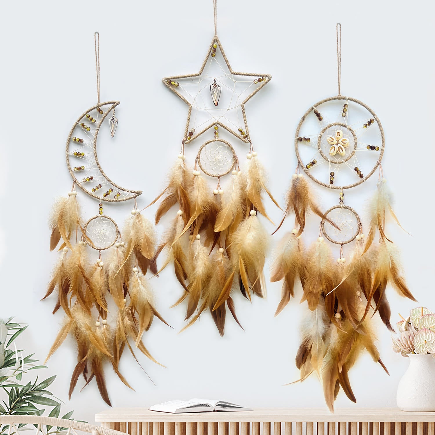 Lasciatevi incantare Olivenorma Stars Moon Sun Indian Feather Dream Catcher. Meticolosamente realizzato a mano con dettagli intricati, emana energia positiva, serenità e un pizzico di misticismo, trasformando il vostro spazio in un paradiso di tranquillità.