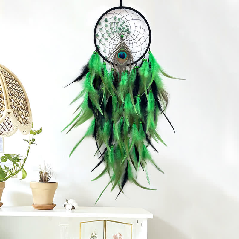 Olivenorma Acchiappasogni in piuma di pavone intrecciata con perline in pietra naturale