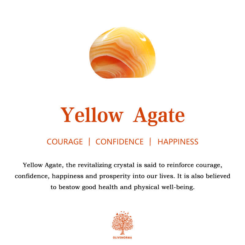 Agata gialla, il cristallo rivitalizzante, si dice che rinforzi il coraggio, la sicurezza, la felicità e la prosperità nelle nostre vite. Si ritiene inoltre che conferisca buona salute e benessere fisico.