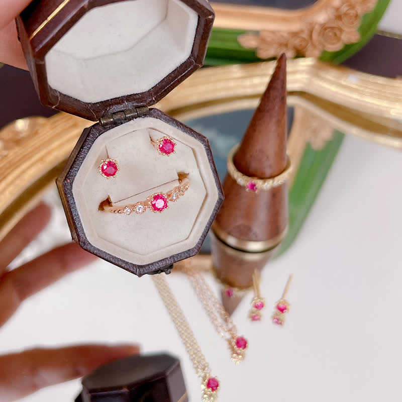Il set di collana di granati è composto da una delicata collana, orecchini e un anello, ognuno decorato con un'accattivante pietra preziosa di granato rotondo. La tonalità rosso intenso simboleggia passione, amore e vitalità. Questo set elegante è meticolosamente realizzato, creando un look armonioso e sofisticato. Si ritiene che i granati promuovano la creatività, aumentanono la sicurezza e fondano un senso di energia radicata.