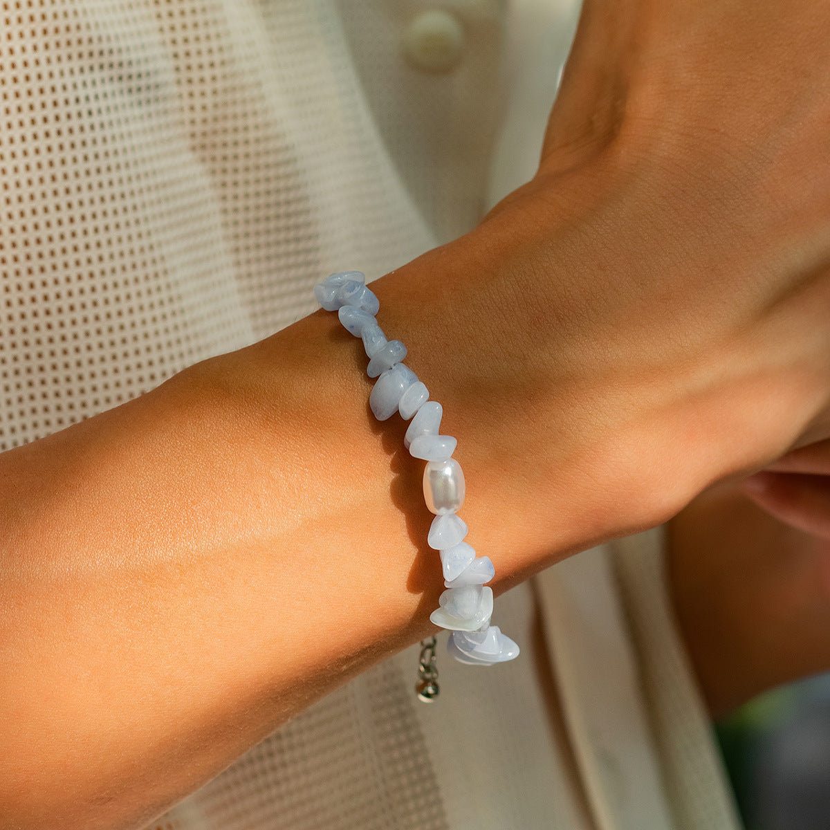 Questo bracciale da uomo unisce elegantemente le energie rilassanti e creative del calcedonio blu con le vibrazioni pure e armoniose delle perle d'acqua dolce. Il calcedonio blu promuove la flessibilità mentale, la destrezza verbale e un'immagine positiva di sé, mentre le perle d'acqua dolce donano un senso di purezza, armonia e umiltà a chi lo indossa. Insieme, creano un pezzo che non solo è un accessorio, ma infonde anche a chi lo indossa una calma sicurezza e una spinta creativa, rendendolo un compagno ideale per la crescita e l'espressione personale.